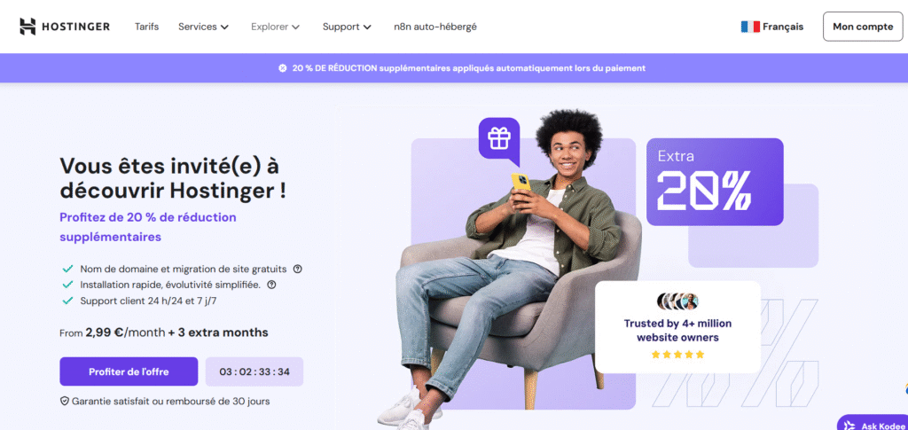 R : Pour un site rapide et bon marché, je recommande Hostinger [mon lien d’affiliation]. Pour traffic élevé, privilégiez un plan avec ressources dédiées.